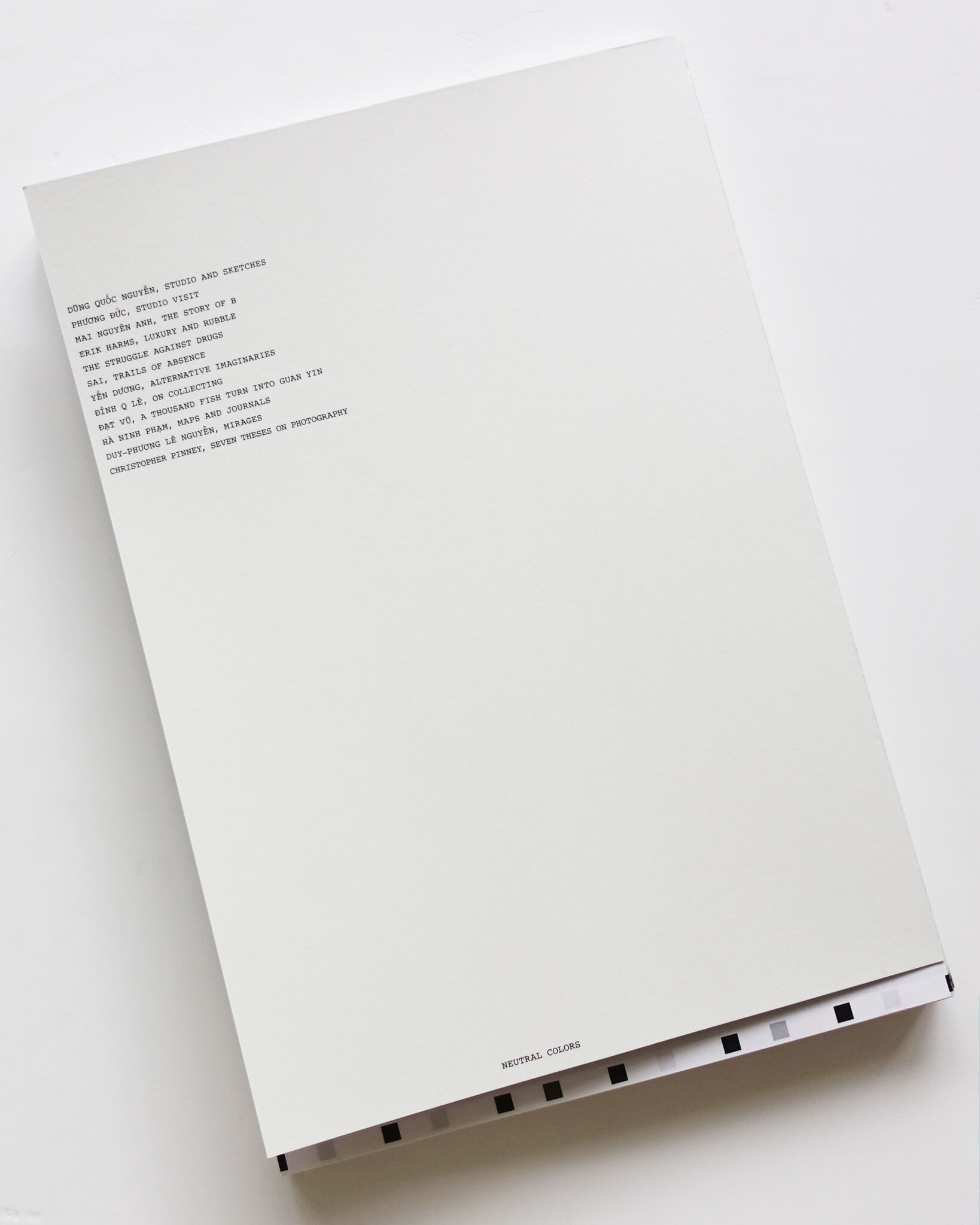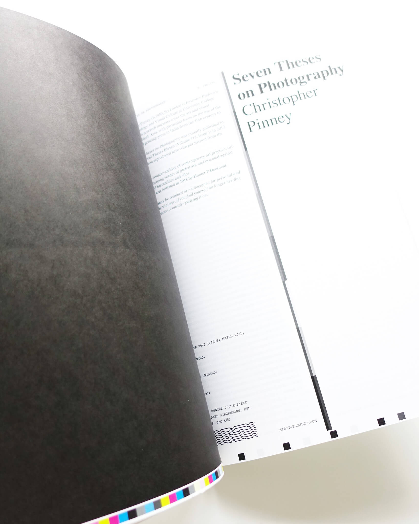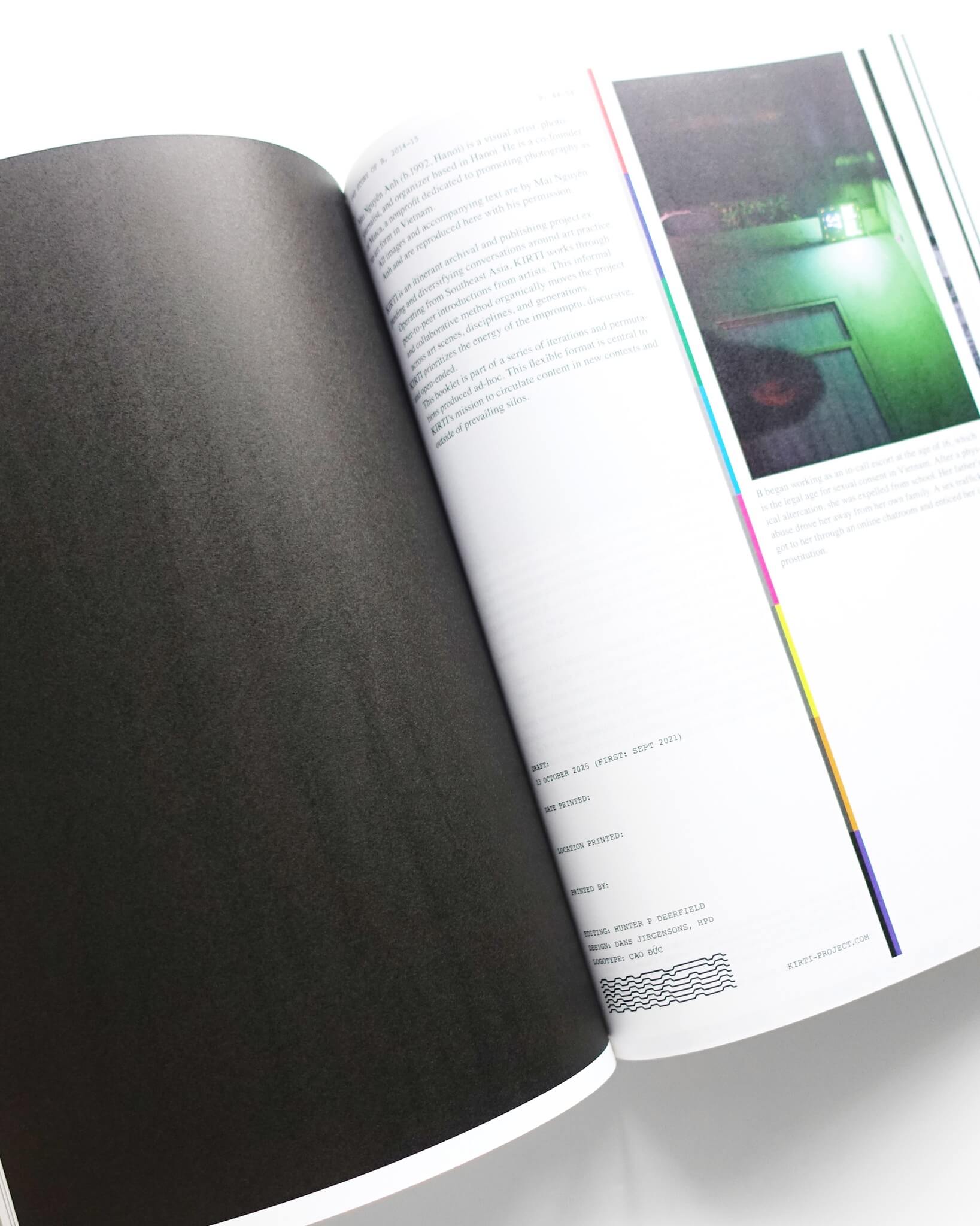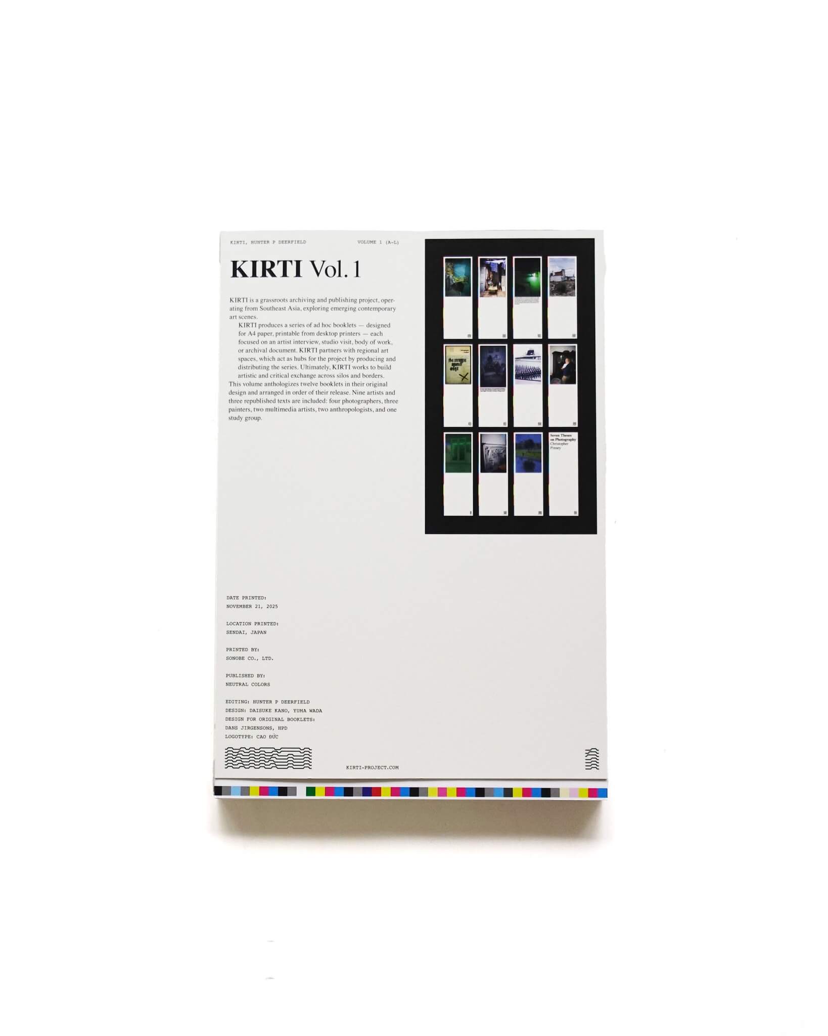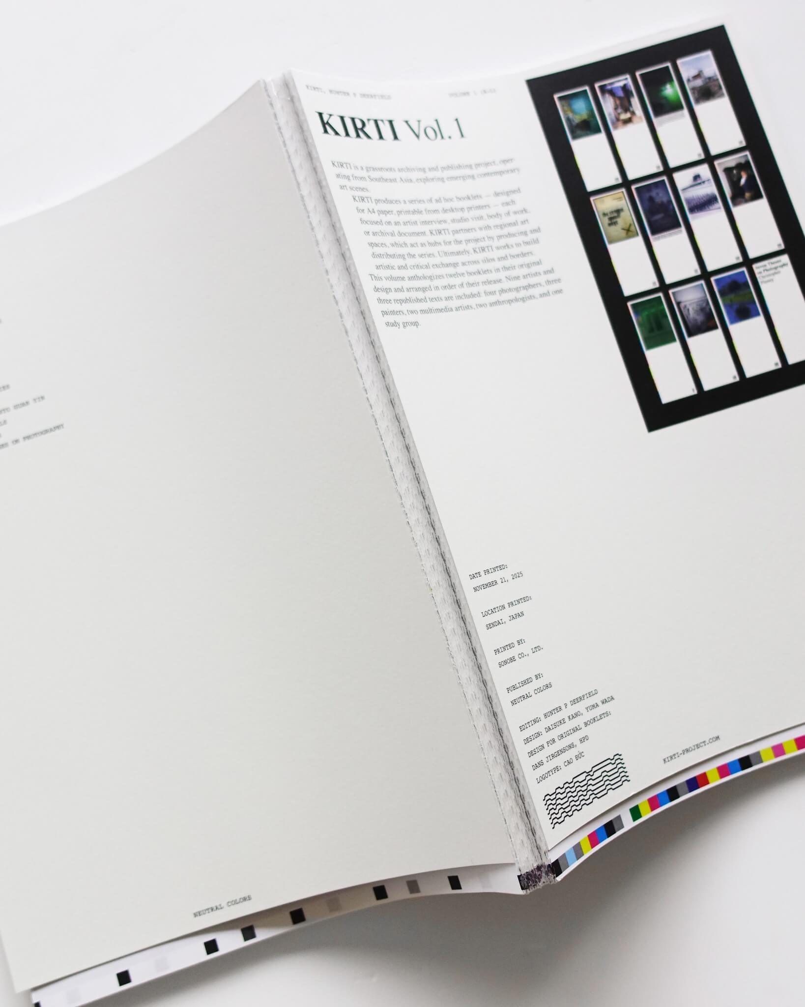 ベトナムを拠点に活動するリサーチャー、Hunter P Deerfeldの作品集。彼が手がける「KIRTI」というプロジェクトのアーカイブとなる一冊。KIRTIプロジェクトは、Hunter自身が各国のアーティストにインタビューを行い、その地域のコピーセンターなど身近な印刷方法で刷られる。形式は一般的な A4サイズを二つ折りにしたシンプルなもの。政治的な検閲や印刷費の高騰など、そもそも出版が難しかったり、発表のためのプラットフォームが限られたりすることへの一つの対抗的アプローチでもある。各冊子は制作日や制作場所(都市・国)が手書きで記されており、配布されるごとに更新され、印刷される。アーティスト自身がエディションとなり、土地に“落とし込む”ように配布されることでプロジェクトは継続的に展開されていく。本書は12の冊子をまとめたもの。KIRTIプロジェクトの精神を受け継ぎ、A4サイズをそのままデザインに落とし込んでいる。textは英語のみ。
