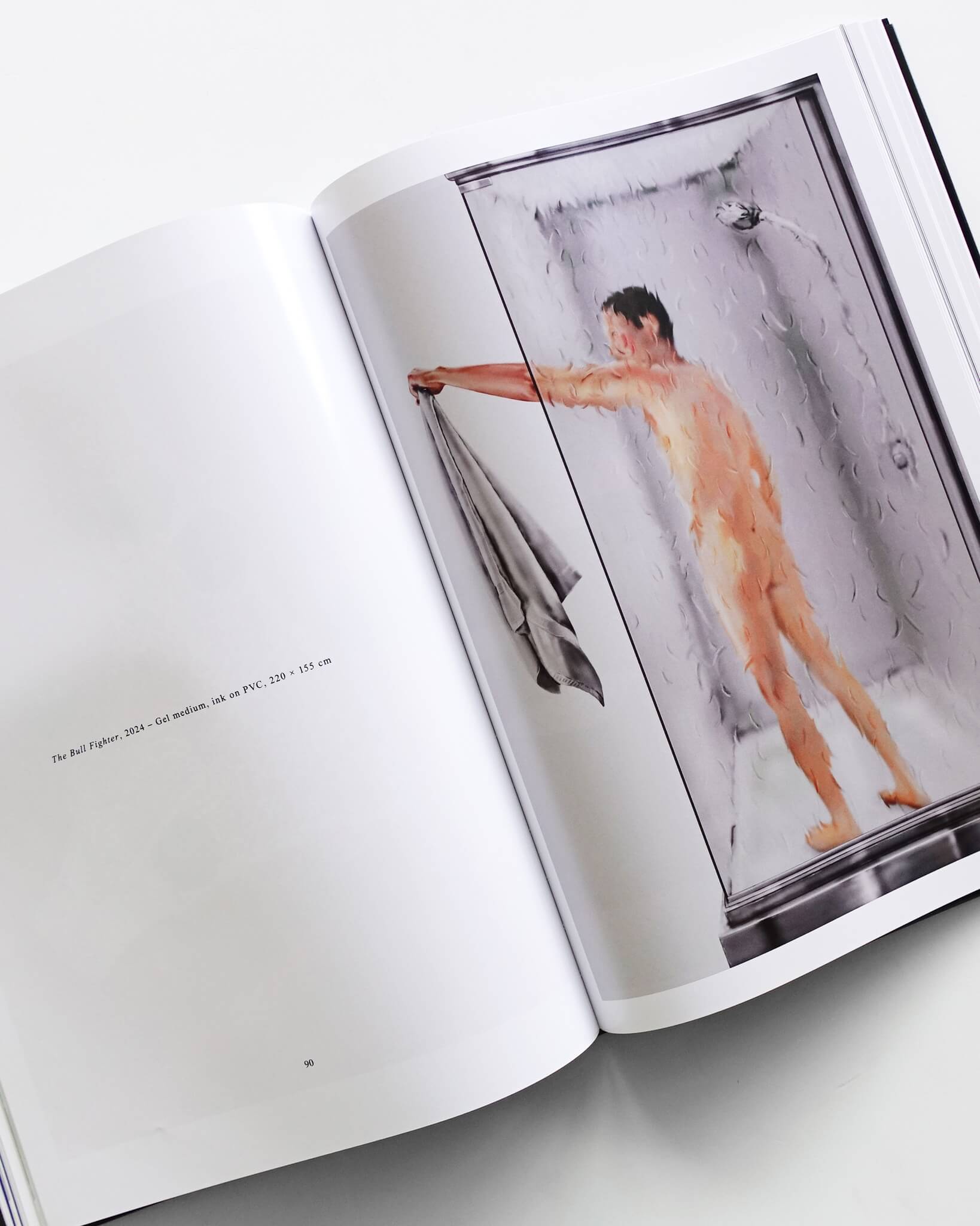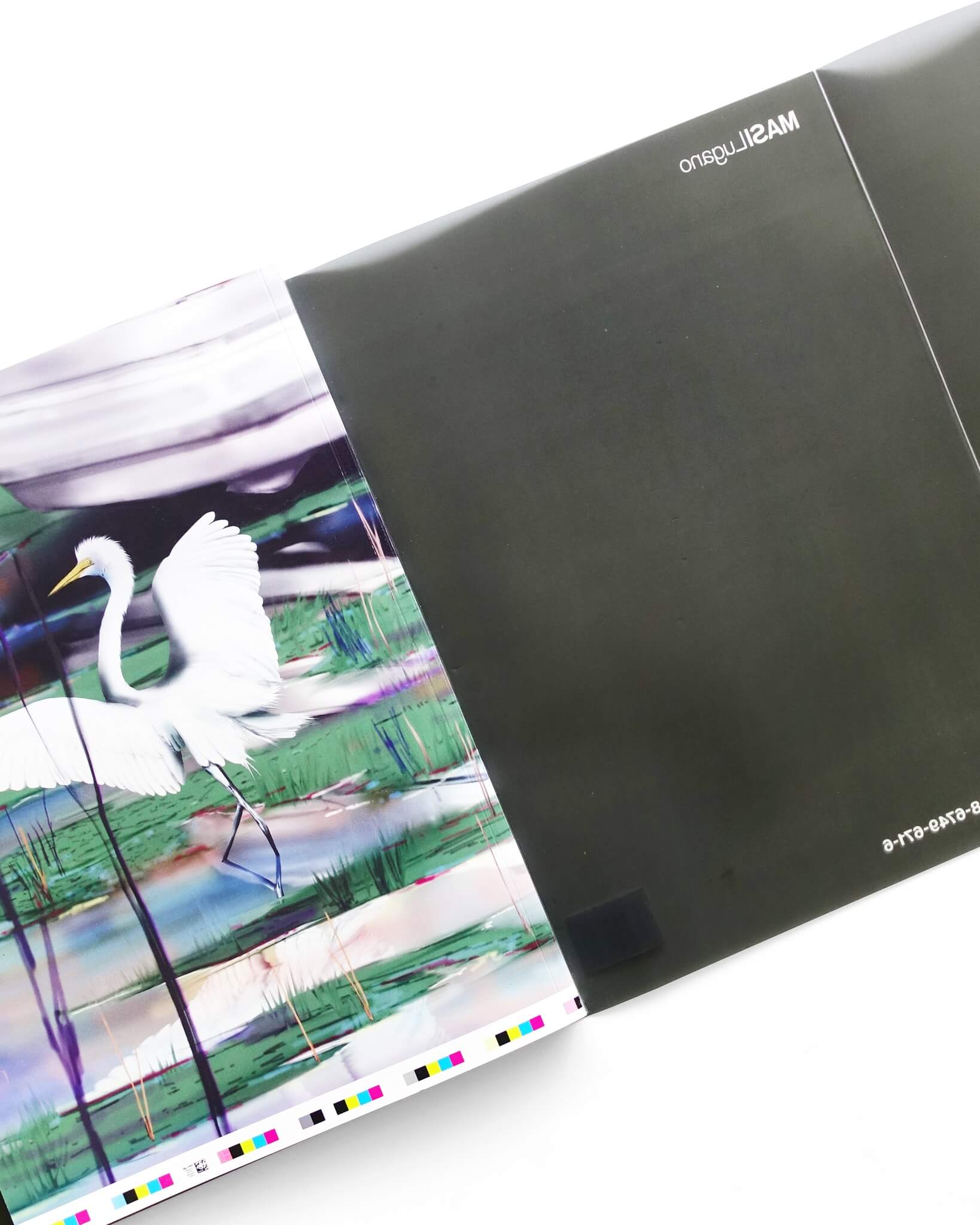 印刷されるまで本質的にサイズを持たない作品は、ズームインとアウトを繰り返し、狂気的なまでにスクロールバーを伸縮させる。デジタル上で彩色される彼女の作品と対応するように、本書はキャストコートの艶めく用紙にグロッシーな質感を伴い定着される。作品を眺望していた読者の視点はあるとき、突然距離を失い絵画に急接近する。しかしトリミングされた断片は単なるクロースアップではない。本の判型がこの世界の輪郭ではないことを、全紙いっぱいに印刷された絵画が耳打ちする。折り畳まれ、方向感覚を失った作品を彷徨う読者に確かなのは、下部に配置された色玉のコンパスのみだ。不透明に近い濃いダークグレーのビニールカバーは、他者同士を覗き見ようとする欲望の視線を、フィルターのように遮断する。