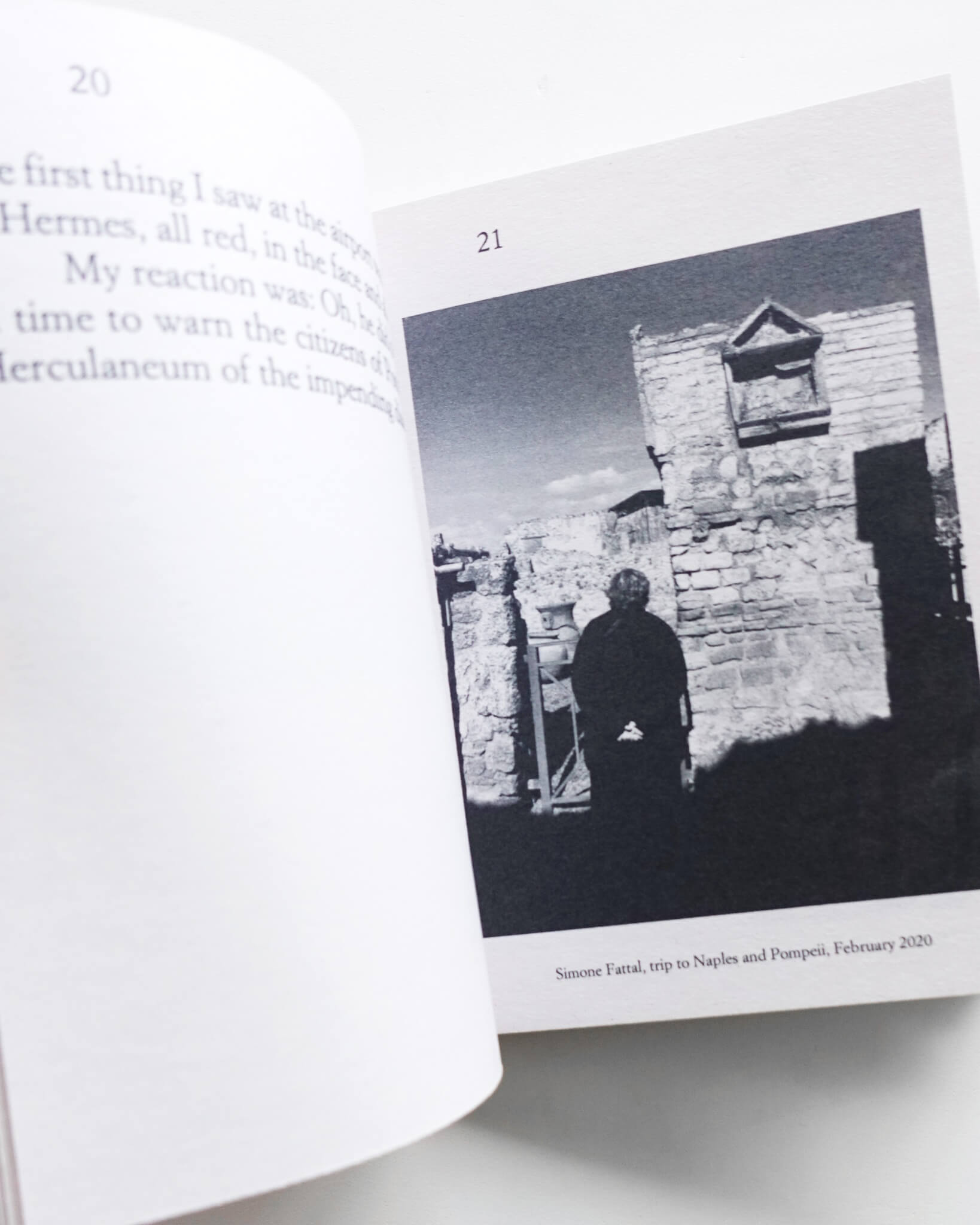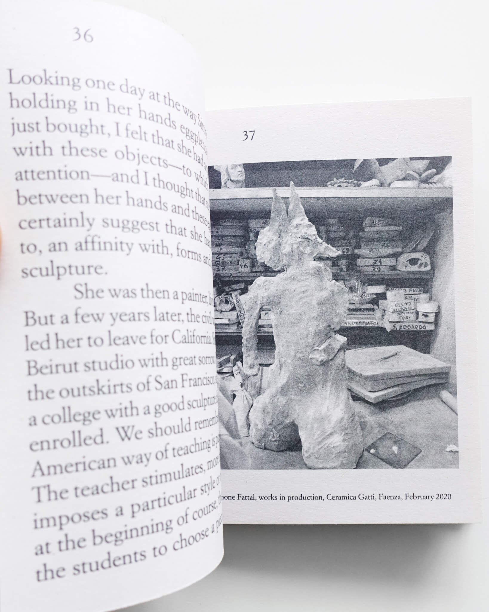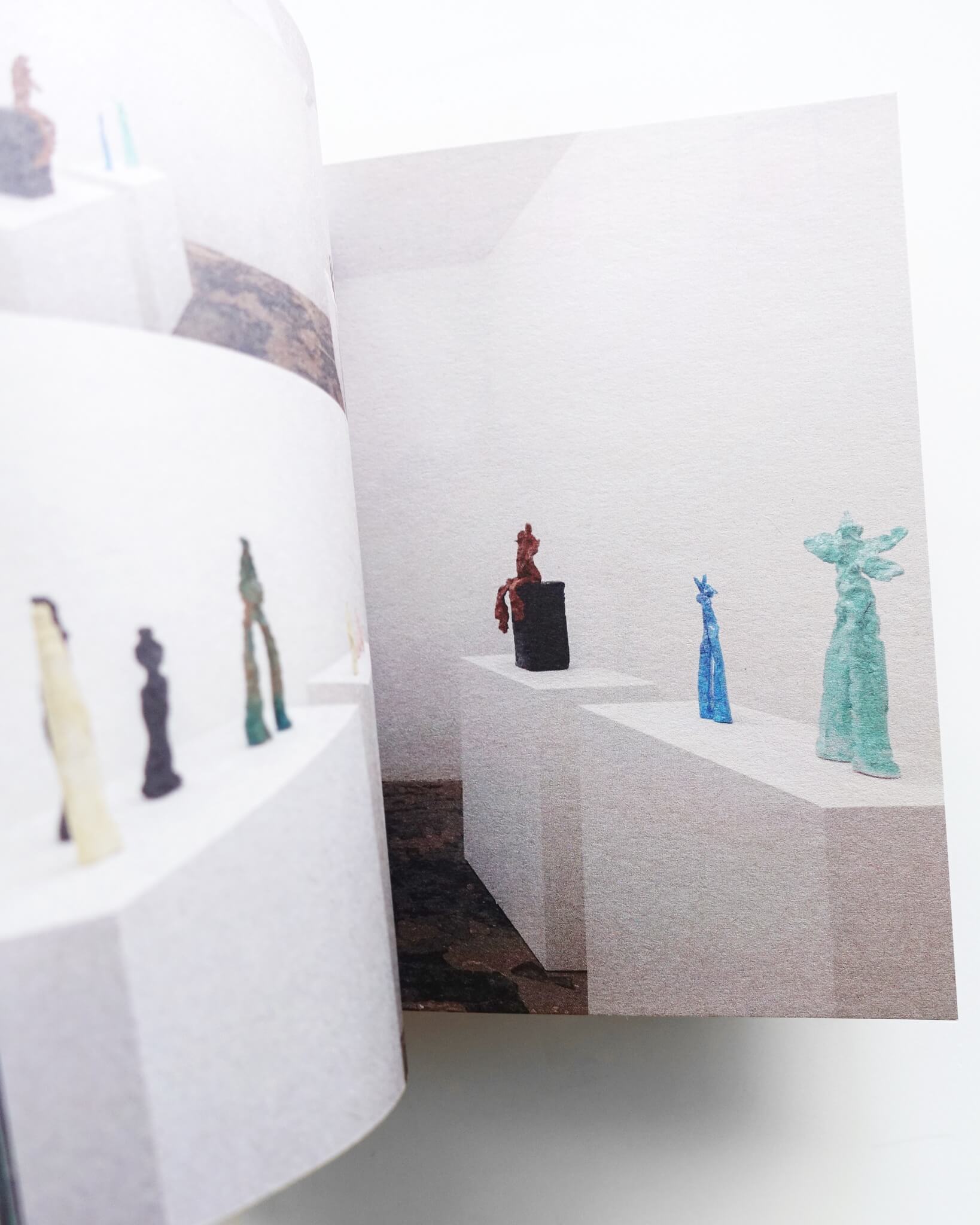 考古学と神話の知の体系を探求し、古代史や現代詩など多様な源泉から着想を得て歴史と記憶を重ね合わせる彼女は、一瞬にして地中に埋まり消滅した古代都市ポンペイをテーマに据える。豪奢で開放的な都市に突然訪れた死を、彼女は自身の故郷に重ね合わせる。レバノンで起きた核爆発もまた、街全体を消し去るほどではないものの、ポンペイほどの広さの地域が一瞬にして吹き飛んだ。死の瞬間、生きていたものたちに再び生命を吹き込むように、彼女は彫刻を制作する。小さな判型の本書は彼女のリサーチの道行きをフィールドノートのように案内する。従来のカタログにおけるテキストと図版の関係は逆転し、作品の展示風景は、本書が終わりを告げる最後の数ページ、息を吹き返すように現れる。