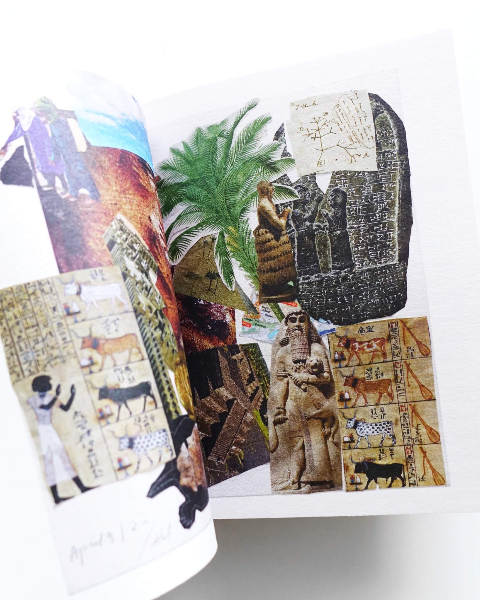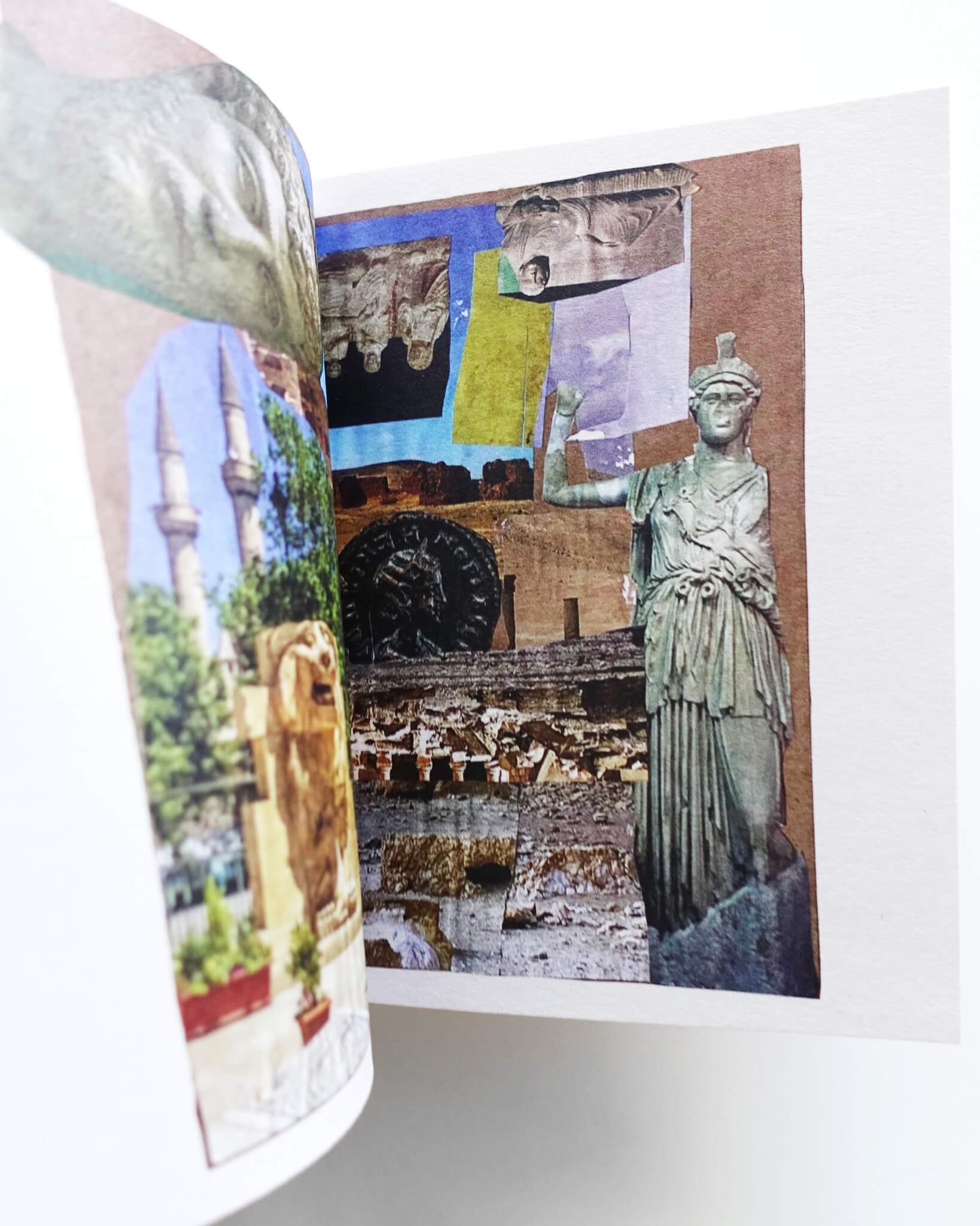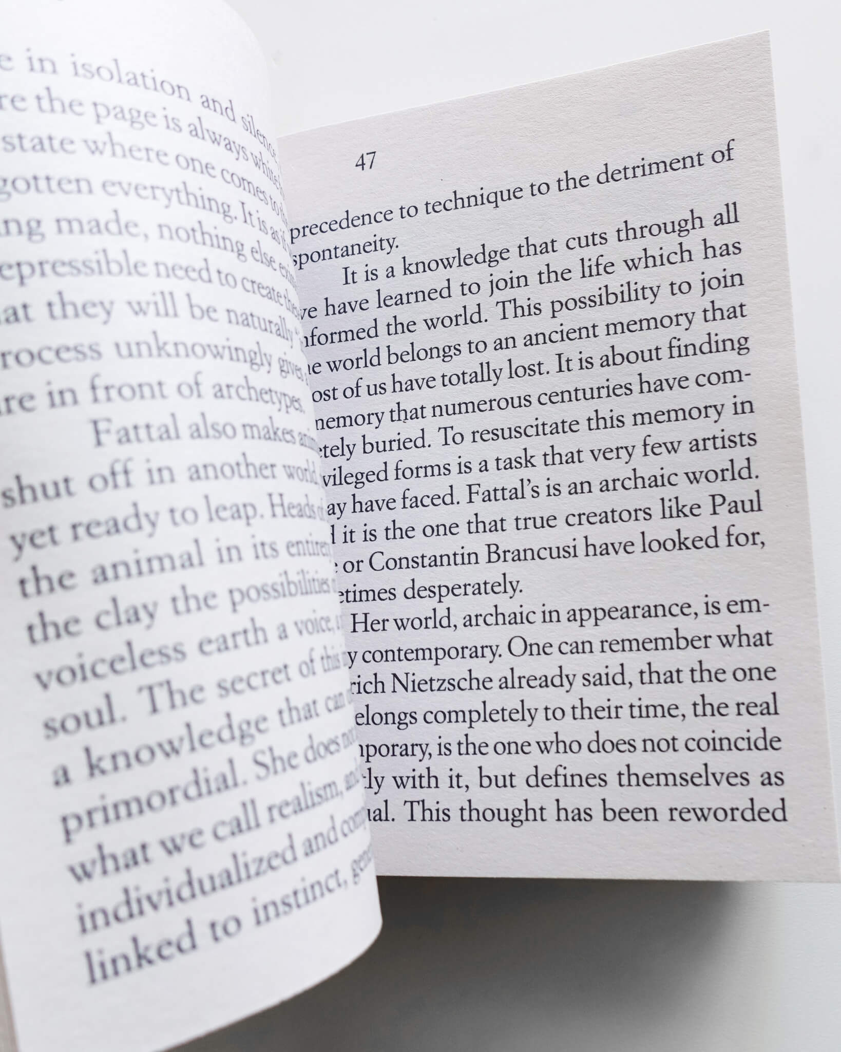 考古学と神話の知の体系を探求し、古代史や現代詩など多様な源泉から着想を得て歴史と記憶を重ね合わせる彼女は、一瞬にして地中に埋まり消滅した古代都市ポンペイをテーマに据える。豪奢で開放的な都市に突然訪れた死を、彼女は自身の故郷に重ね合わせる。レバノンで起きた核爆発もまた、街全体を消し去るほどではないものの、ポンペイほどの広さの地域が一瞬にして吹き飛んだ。死の瞬間、生きていたものたちに再び生命を吹き込むように、彼女は彫刻を制作する。小さな判型の本書は彼女のリサーチの道行きをフィールドノートのように案内する。従来のカタログにおけるテキストと図版の関係は逆転し、作品の展示風景は、本書が終わりを告げる最後の数ページ、息を吹き返すように現れる。