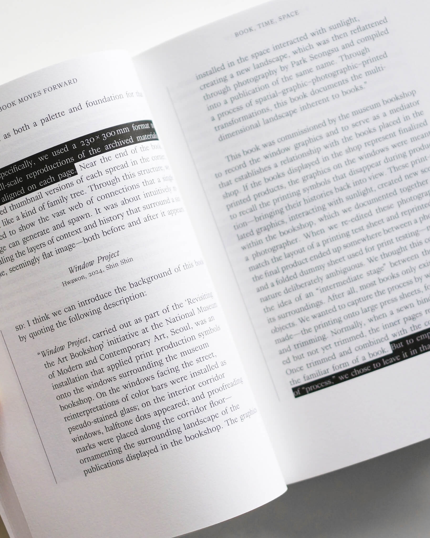 この対話は2024年に同書店で開催された講演をもとに、Shin Shinの事務所でさらに発展させたもの。彼らは本における歴史的転換は二つあると述べる。一つは金属活字の発明であり、もう一つは製本・生産方法の変革である。後者の変化は重く権威的な本を、大衆的なペーパーバックへと解放した。彼らが制作してきた本は、ほとんどが並製本(ペーパーバック)か、またその派生である。彼らにとって本は、書棚を知的な顔で埋める壁紙ではなく、容易にアクセス可能で解釈を広く提供する情報媒体である。それぞれの制作物を紐解くと、「実験的」と捉えられがちな彼らの活動はむしろ、内容に対する控えめな献身として本に定着していることがわかる。しかし既存の形式に安住することなく、素材や方法を新鮮に捉え直す手つきには、彼らが言及するJohn Morgan (RIP)にも通じる点もあるだろう。