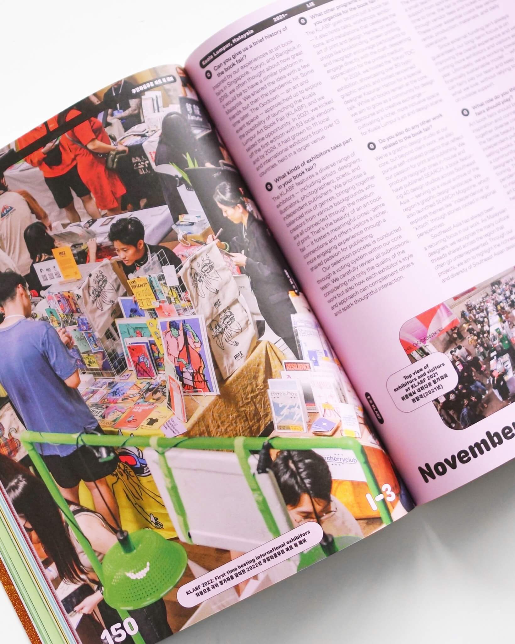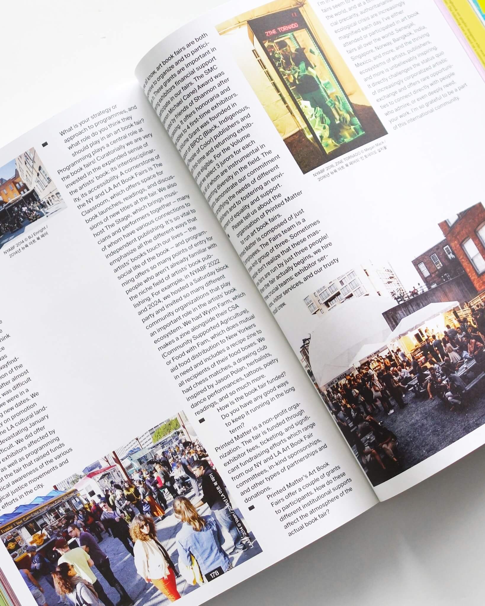 今号ではベルリンを拠点とするデザイナー、Sam KimとShin Dokhoが企画を担当し、老舗から新興まで、およそ30のブックフェア主催者にインタビューを試みる。リストを眺めるだけでも、African Art Book Fair、Focal Point: Shariah Art Book、Singapore Art Book Fairなど、欧米を中心としたラインナップから大きなシフトチェンジが起きつつあることが見て取れる。また、BookBau FesitivalやBring Your Own Bookといった学生主導のフェアも多く開催され、彼らによる座談会も収録されている。