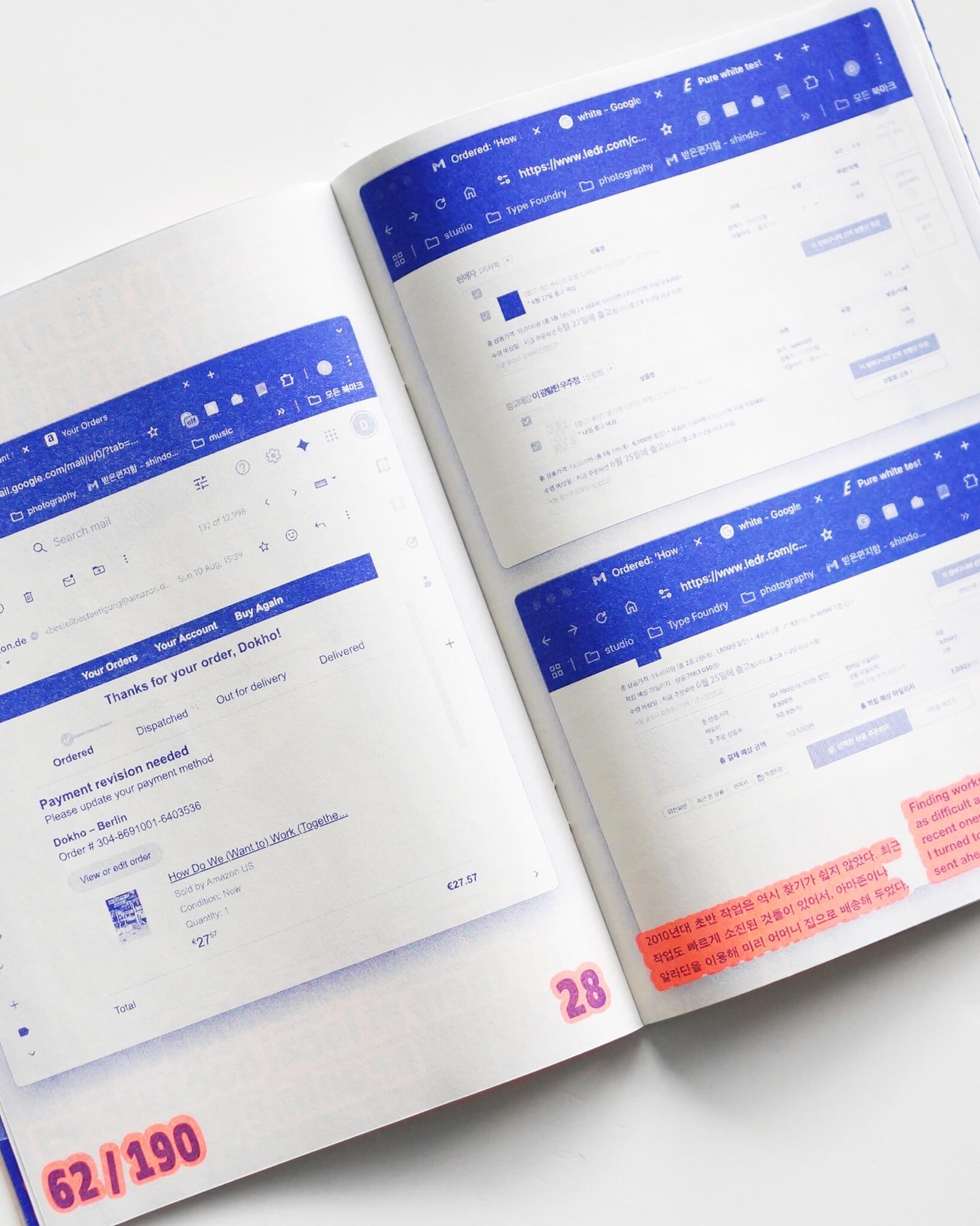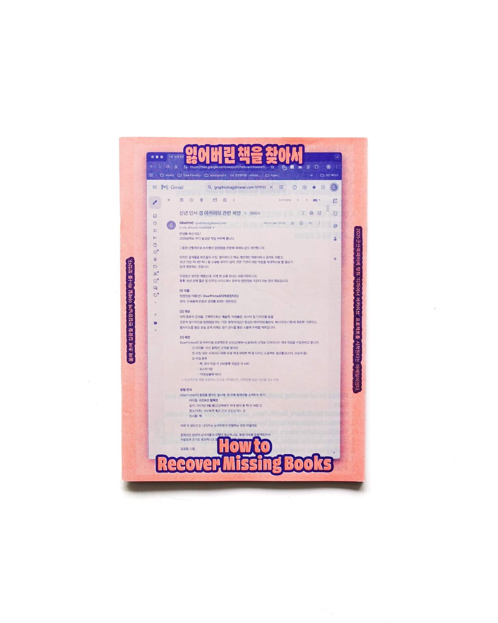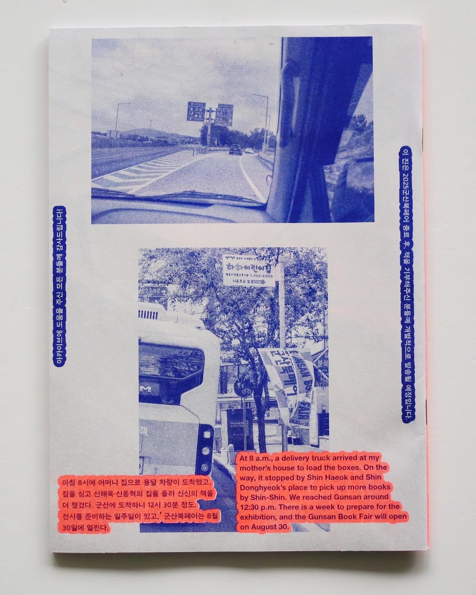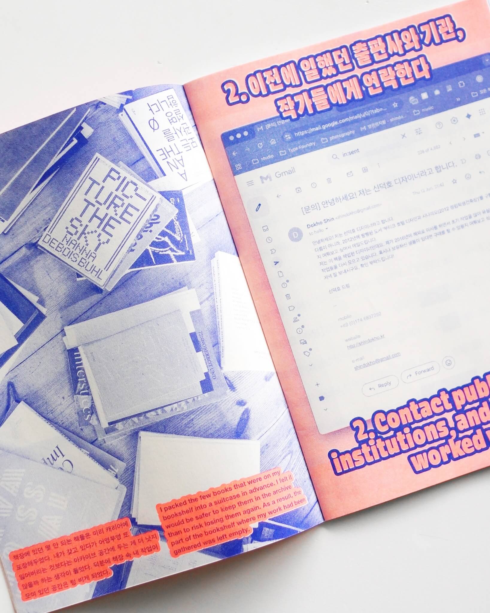 韓国出身でベルリンを拠点に活動するデザイナー、Shin Dokhoによる冊子。Gunsan BookFairに参加した彼は自身の仕事のアーカイブの展示を求められるものの、過去15年間で制作した190冊の本のうち、1/6しか所有していないことに気がつく。本書はそれら紛失した本たちをどのように見つけ出すのかの記録である。