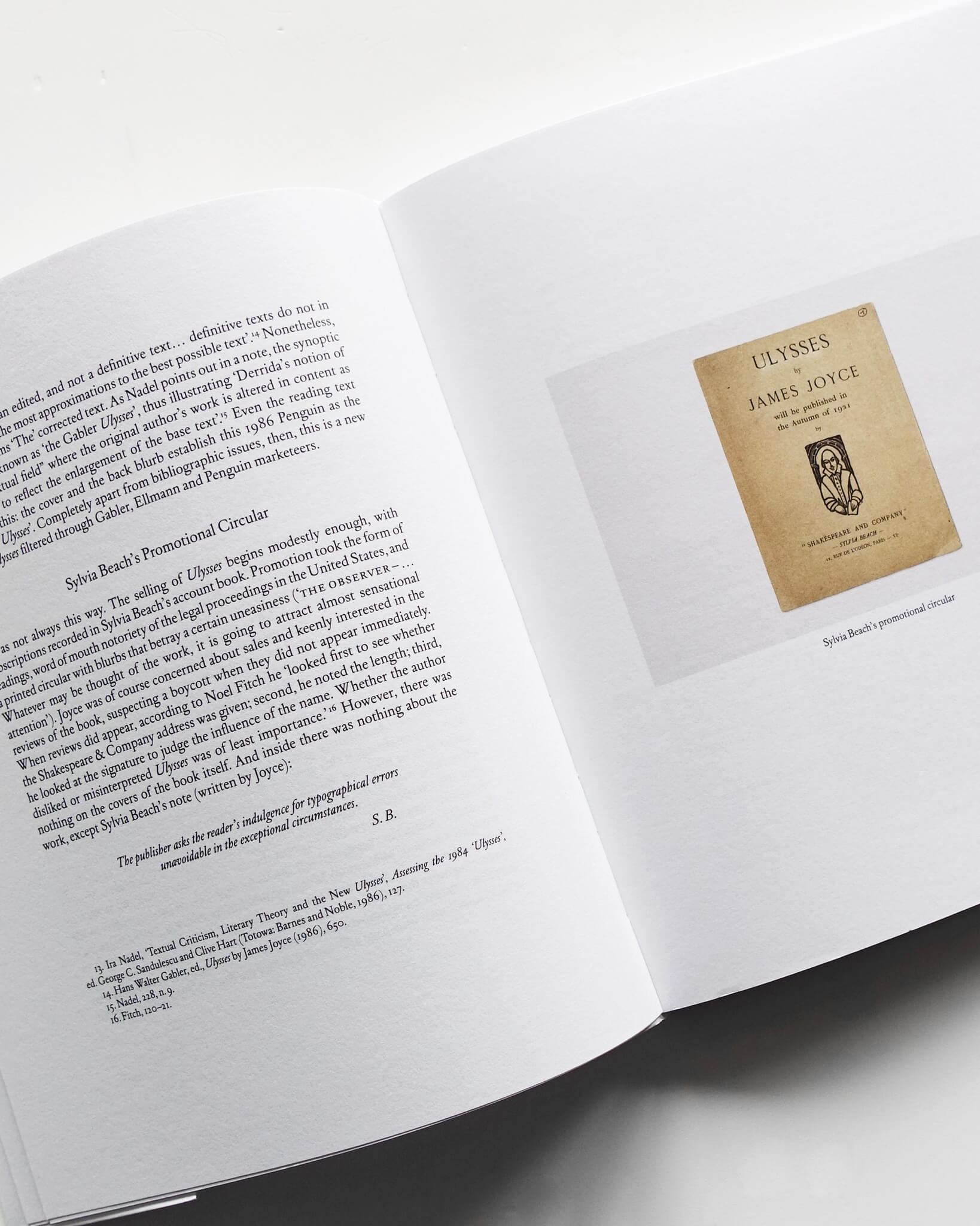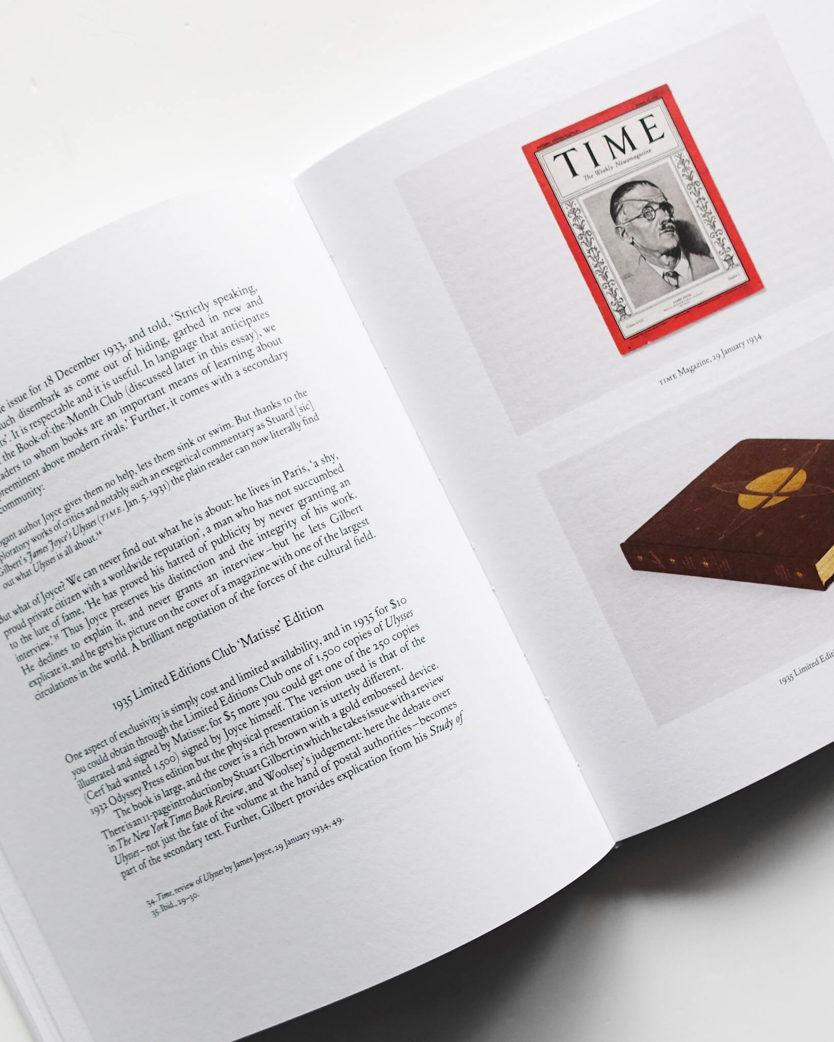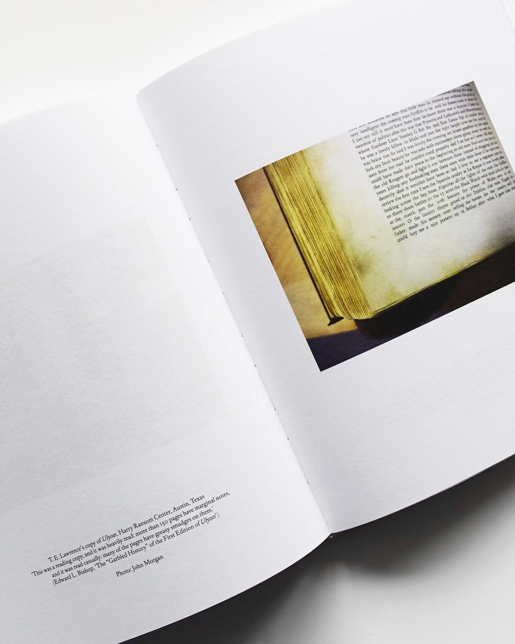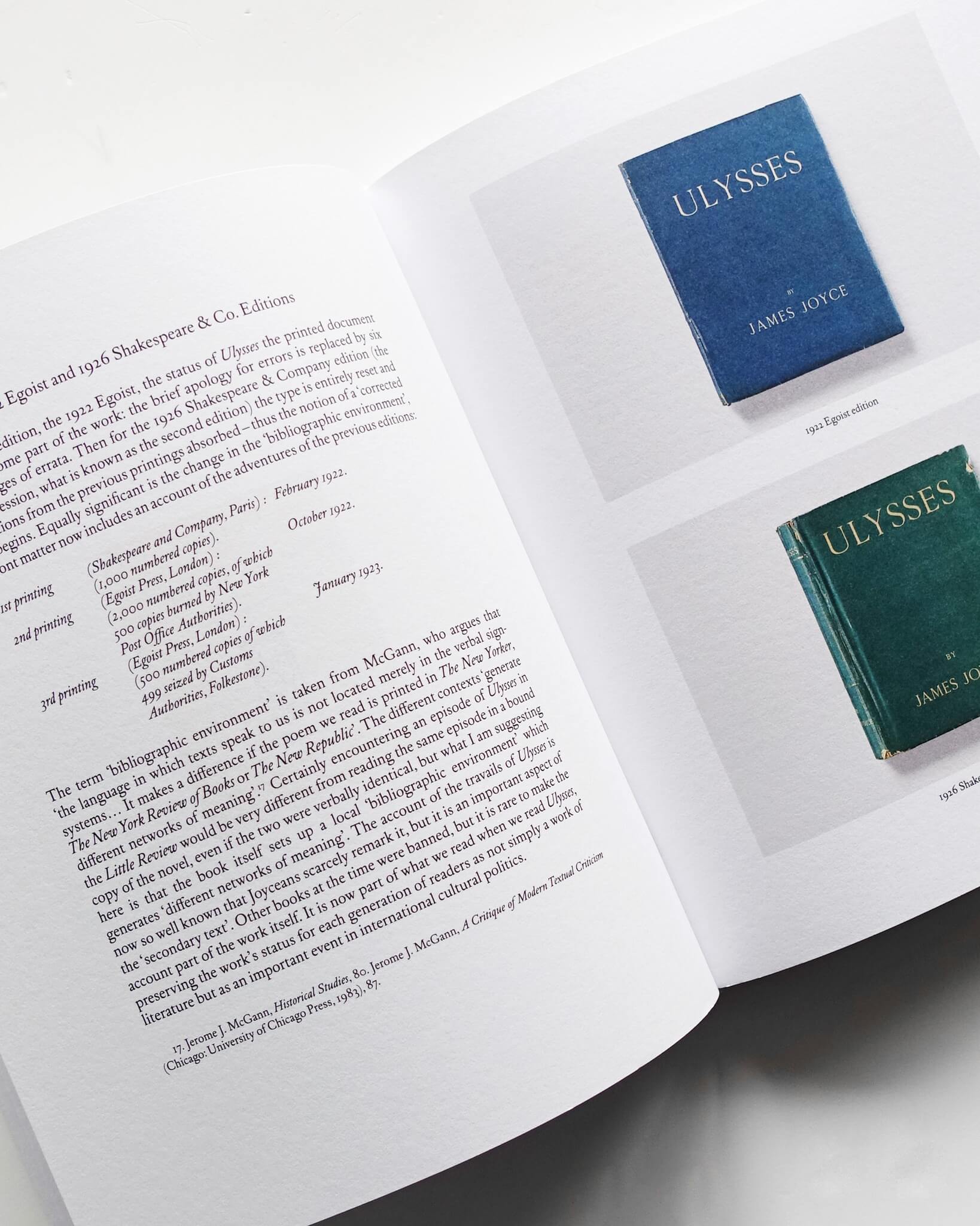 もう一つの論考ではBishopとMorganが、『Usylessly』第1版制作のために、テキサス州オースティンのハリー・ランサム・センター所蔵の1922年版を追う旅を記録している。William H. Gassが「白い島々の連なり、ギリシャの海に散らばる花びらのように」と述べるように、表紙の青はジョイスにとって物語と不可分なものであった。印刷業者や画家が協力して理想の青を調色したもののうまくいかず、最終的に薄い紙にリトグラフで印刷されたカバーを手にしたMorganは、インキ転写の不均一が、かえって美しい不完全さを実現していると指摘する。