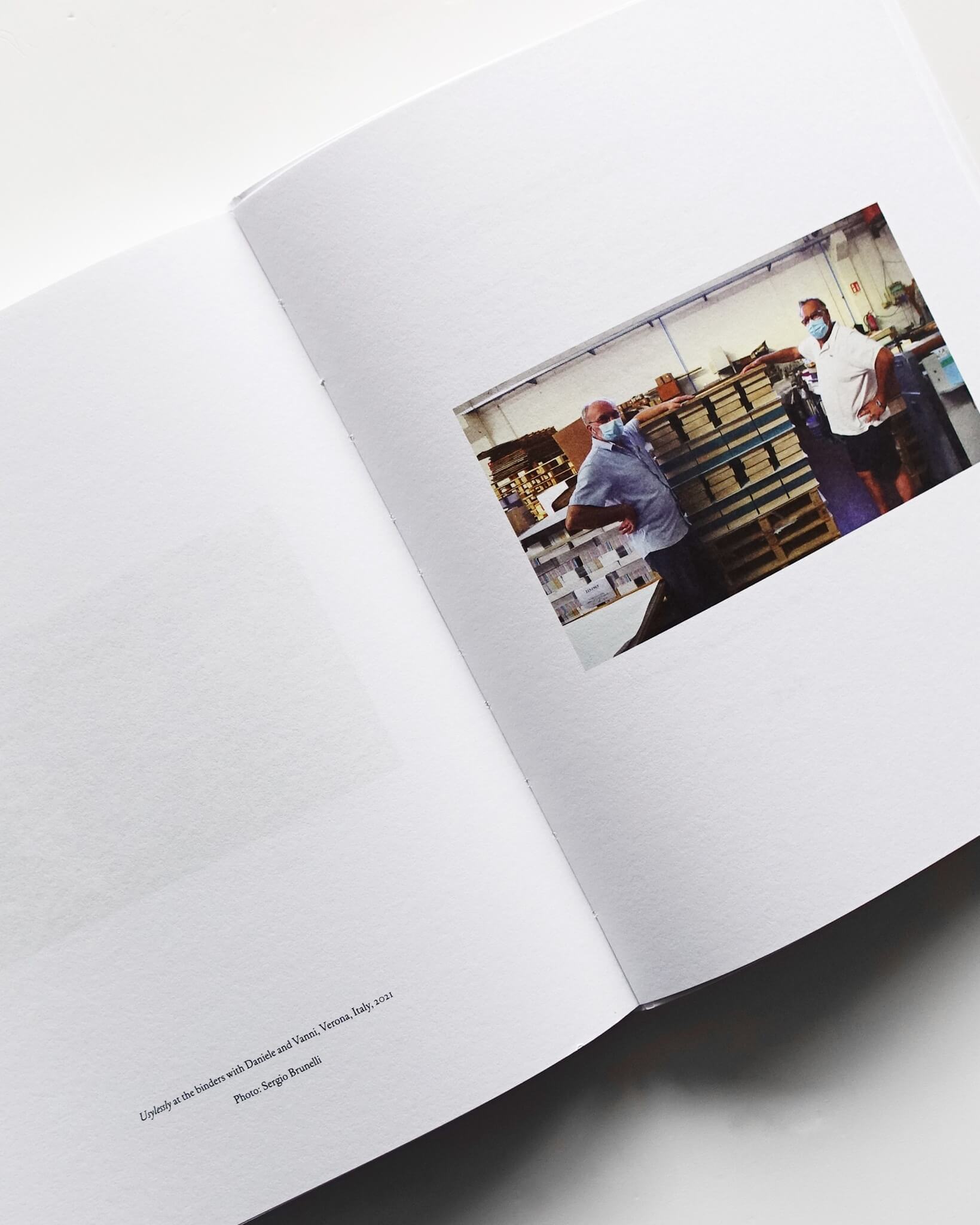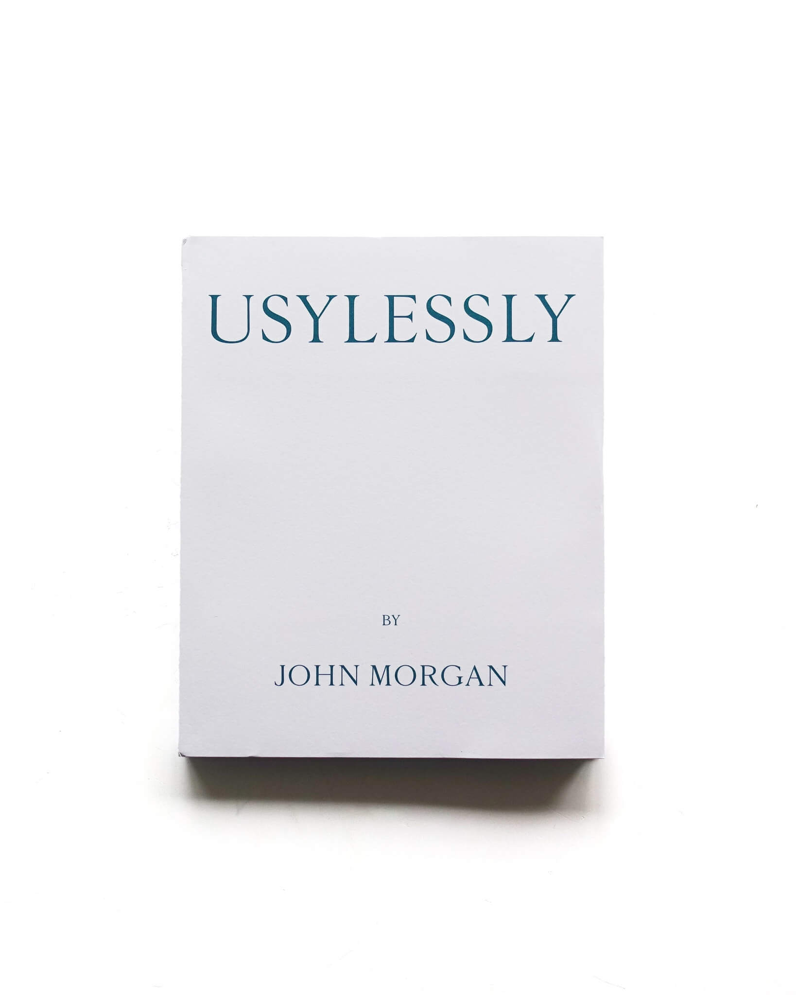 本書はそんな『Usylessly』の第2版である。第1版と異なり、1922年の初版を再現するものではない。厚みは印刷部分のみを抜き出したために薄く、青い表紙に白く抜き出された文字という関係は反転している。上述の二つの論考に加え、『KIND OF BLUE』と題したMorganによるビジュアル・エッセイが新たに収録されている。発刊はTen Thousand Angels Press。「針の先に何人の天使が踊れるか、あるいは立てるか?」という表現は、一見取るに足らない事柄を考察する比喩としてよく用いられる。「たとえ大多数にとって取るに足らぬことであっても、私は人生と実践の大半を、些細な関心事、ほとんど見えないもの、そうした執着がプロジェクトにもたらしうる質に注いできた。」と彼は述べる。これだけの数の天使たちは、彼を天上に導くどころか未だ紙の上で「プレス」をしている。「それで十分すぎる」。そう書き残し、Morganは旅立っていった。