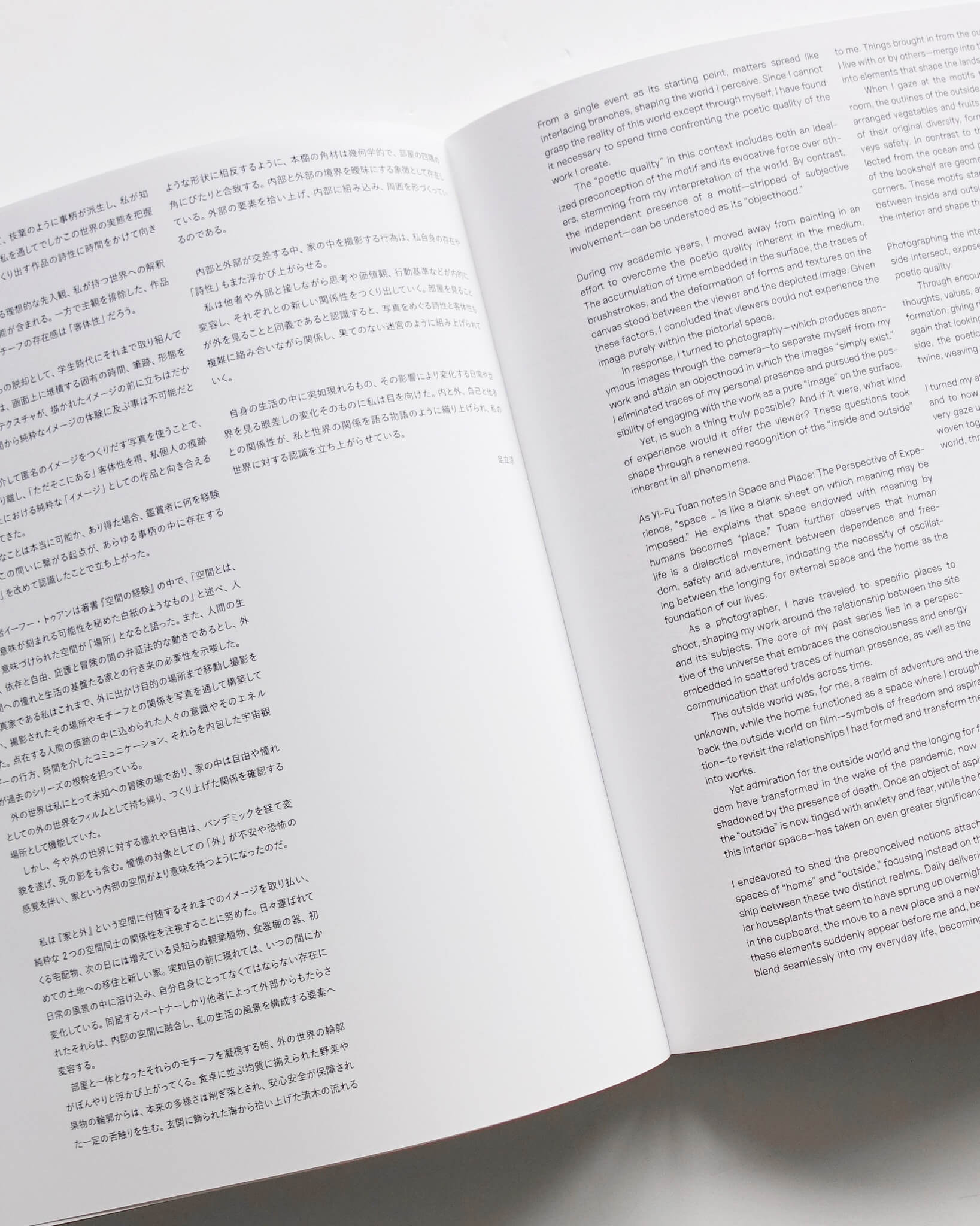 インクジェット印刷の工程を生かして、従来の製本方法では不可能だったコート紙、マットコート紙と交互に紙質が入れ替わるレイアウトを採用。「外の世界」と「家の中」という相反する空間同士の関係と呼応するように、「本の構造」と「写真の流れ」が1冊の本の中に同居する。装丁は加納大輔。聞けば美大時代の先輩後輩だとか。近い距離感が生み出す写真と装丁の呼応。内と外がやがて写真集の中で溶け合っていく様は友情すら感じる。唯一のポートレイトにも感情が揺さぶられる。